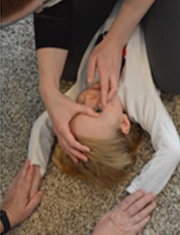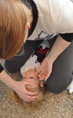 Two adults work together to stabilize a child during contact lens insertion—one straddling the child securely and the other focused on holding the child’s arms. This method is ideal for children who are more active or resistant, ensuring safety, comfort, and precision during the lens care process.
