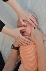 A single caregiver can gently stabilize a toddler by straddling the child with their arms placed against their body. Use one hand to hold their head from moving and your other hand to assist with lens insertion. This approach offers safety and control without applying pressure, and works well for cooperative children or when help isn’t available.